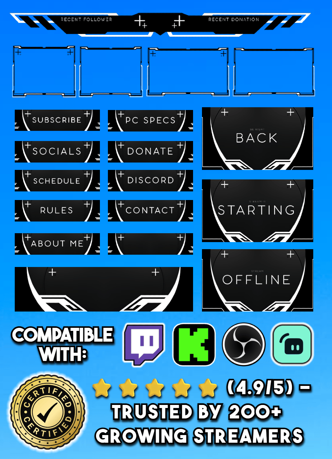 Don't waste hours struggling with design. This Plug & Play kit gives you everything you need to look like a Pro Streamer in under 5 minutes.